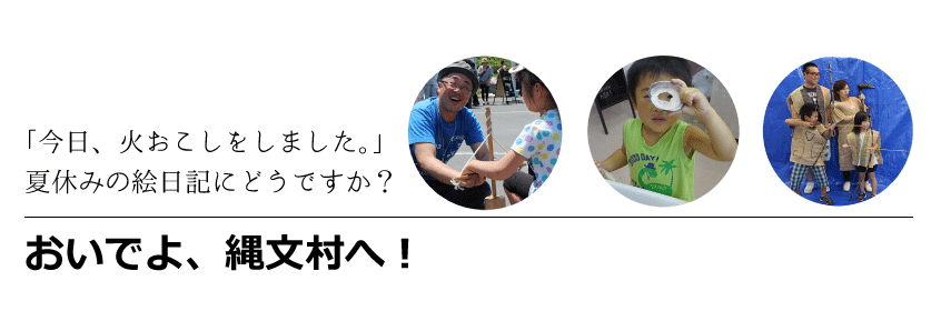 ![]() 夏休みのおでかけは縄文村へ!期間中はいろいろな縄文体験が楽しめます。 作った作品は、自由研究や工作にもぴったり!ぜひ、遊びにきてください♪ |